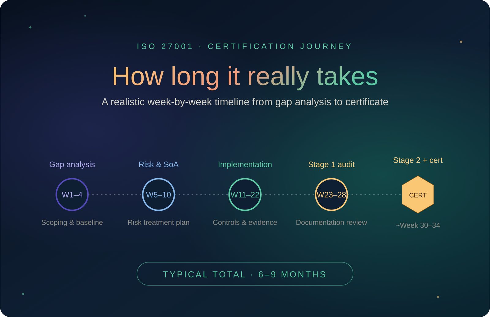 How long does ISO 27001 actually take in 2026? A month-by-month walkthrough of the ten phases, the factors that compress or extend each, and a realistic milestone plan for a 9-month first-time implementation.